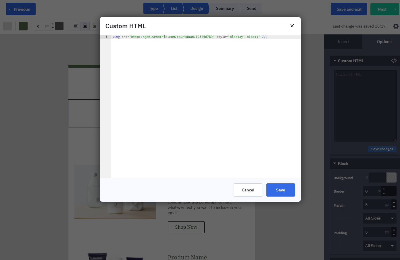 3. Copy the timer code from Sendtric and paste it in the “Custom HTML” section for the HTML block you just added to your template. If you would like your timer to be centered, here is some additional code to help center the timer specifically for the ActiveCampaign platform: