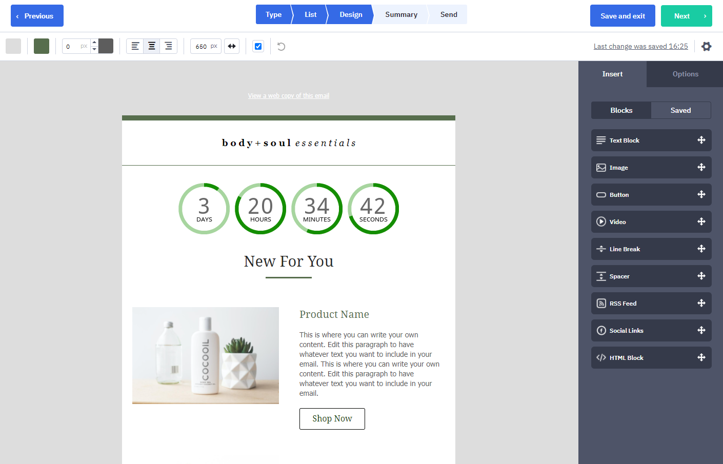 2. Open your ActiveCampaign campaign in the template editor and select the “HTML Block” option in the “Insert” tab. Drag the box into your template where you would like the countdown timer to appear.