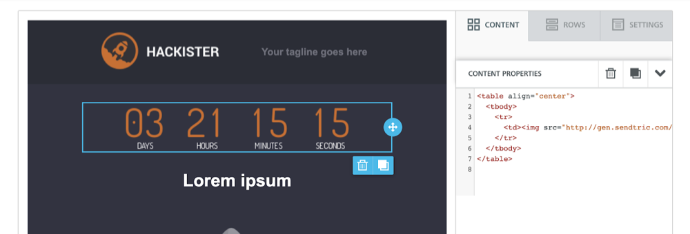 3. Copy the timer code from Sendtric and paste it in the Content Properties section for the HTML block you just added to your template. If you would like your timer to be centered, here is some additional code to help center the timer for all email clients: