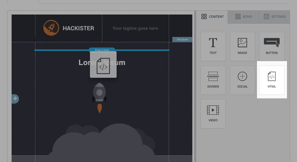 2. Open your Iterable template in the template editor and select the HTML option in the Content tab. Drag the box into your template where you would like the countdown timer to appear.