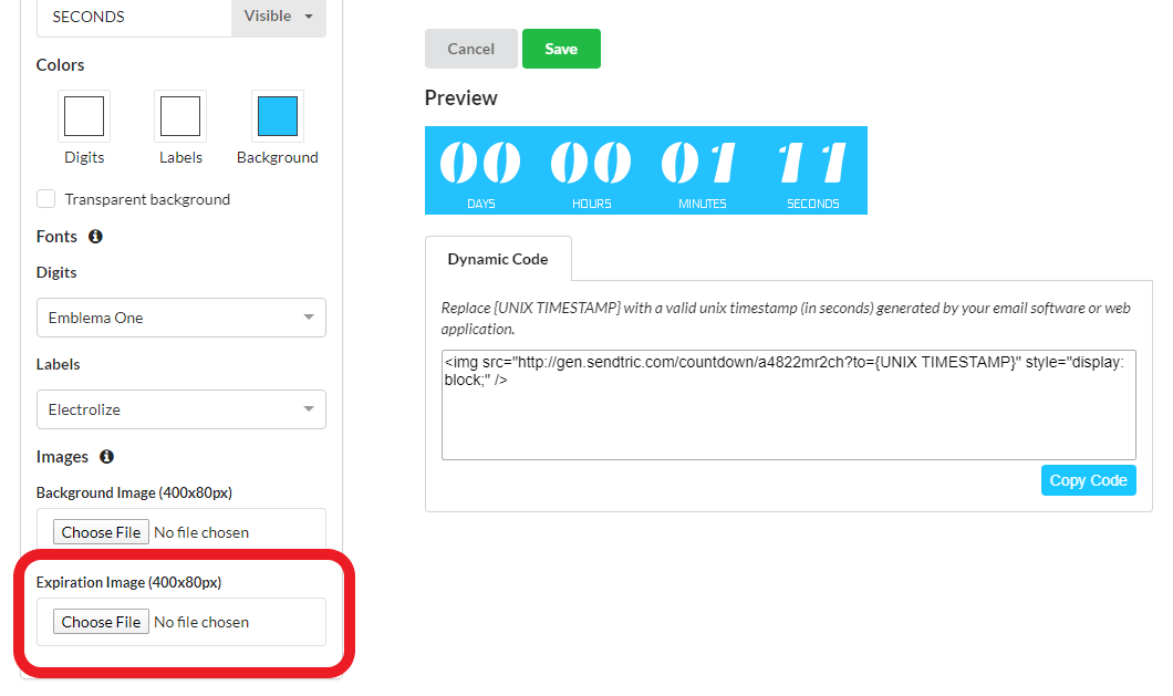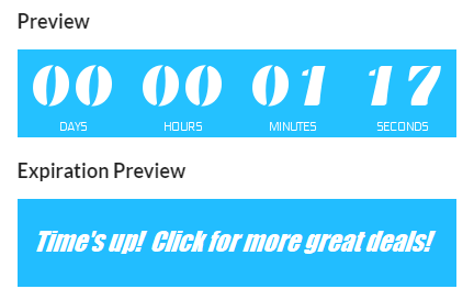 With expiration images, you can customize what displays when your countdown timer ends.  For example, if you have a timer for a limited time sale, instead of having the timer display all zeroes when finished, you could include a message such as “Time’s up!  Check out these other great deals.”  Or you could upload an expiration image that matches the color of your email template background so that the timer disappears when it is finished.