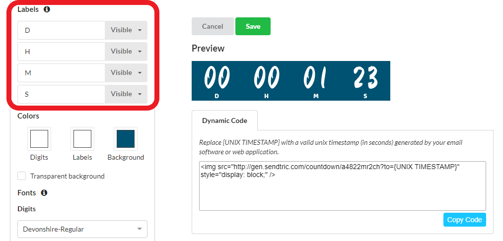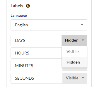 You can add custom labels to your countdown timers in the Pro Edition. This is useful to add a custom language or modify what shows under each number. You can also select from a predefined list of languages using the language dropdown. Hiding the labels is also possible by clearing the text box.