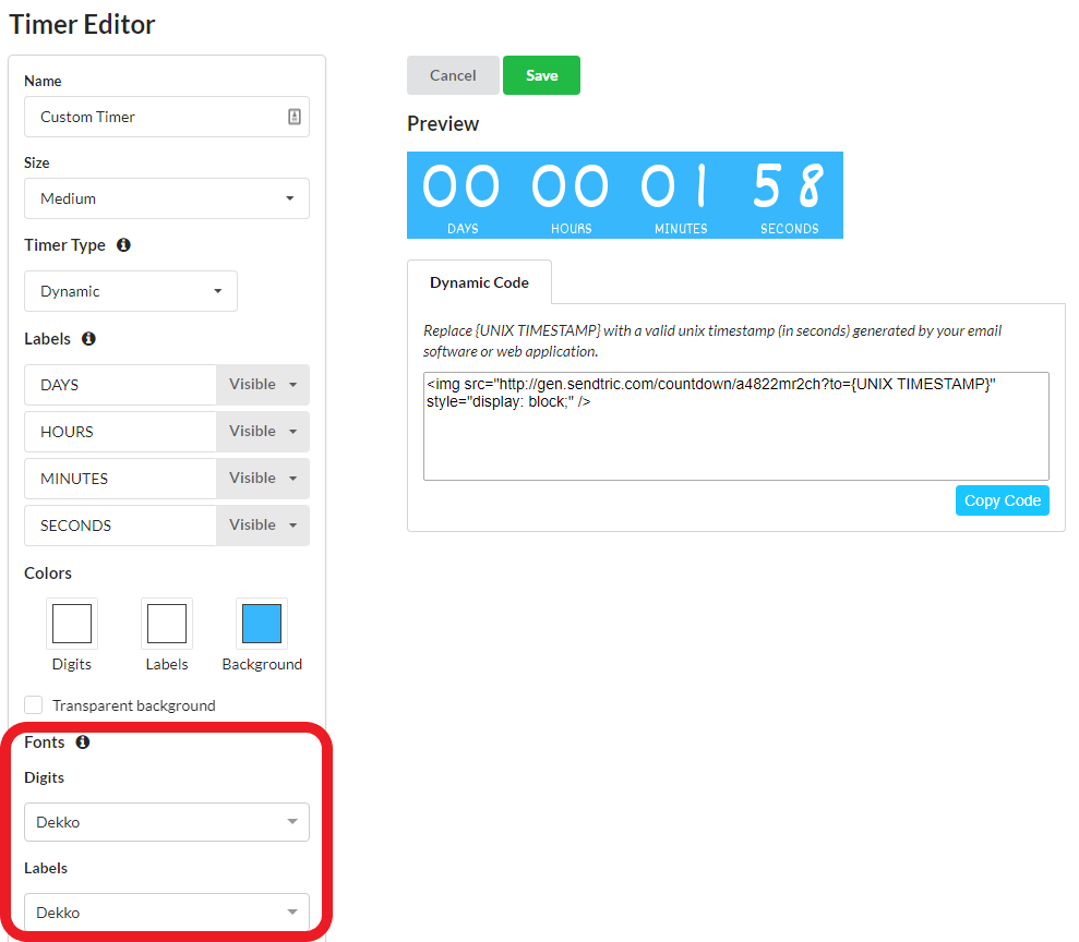 2. Choose a custom font from the fonts section of the editor. You can choose a font for both the labels and the numbers of the timer. You can search for a font by name by typing into the dropdown box: