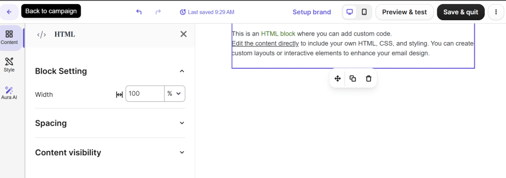 Open your Brevo Email campaign and select whether you want to use their drag & drop editor or their HTML editor.